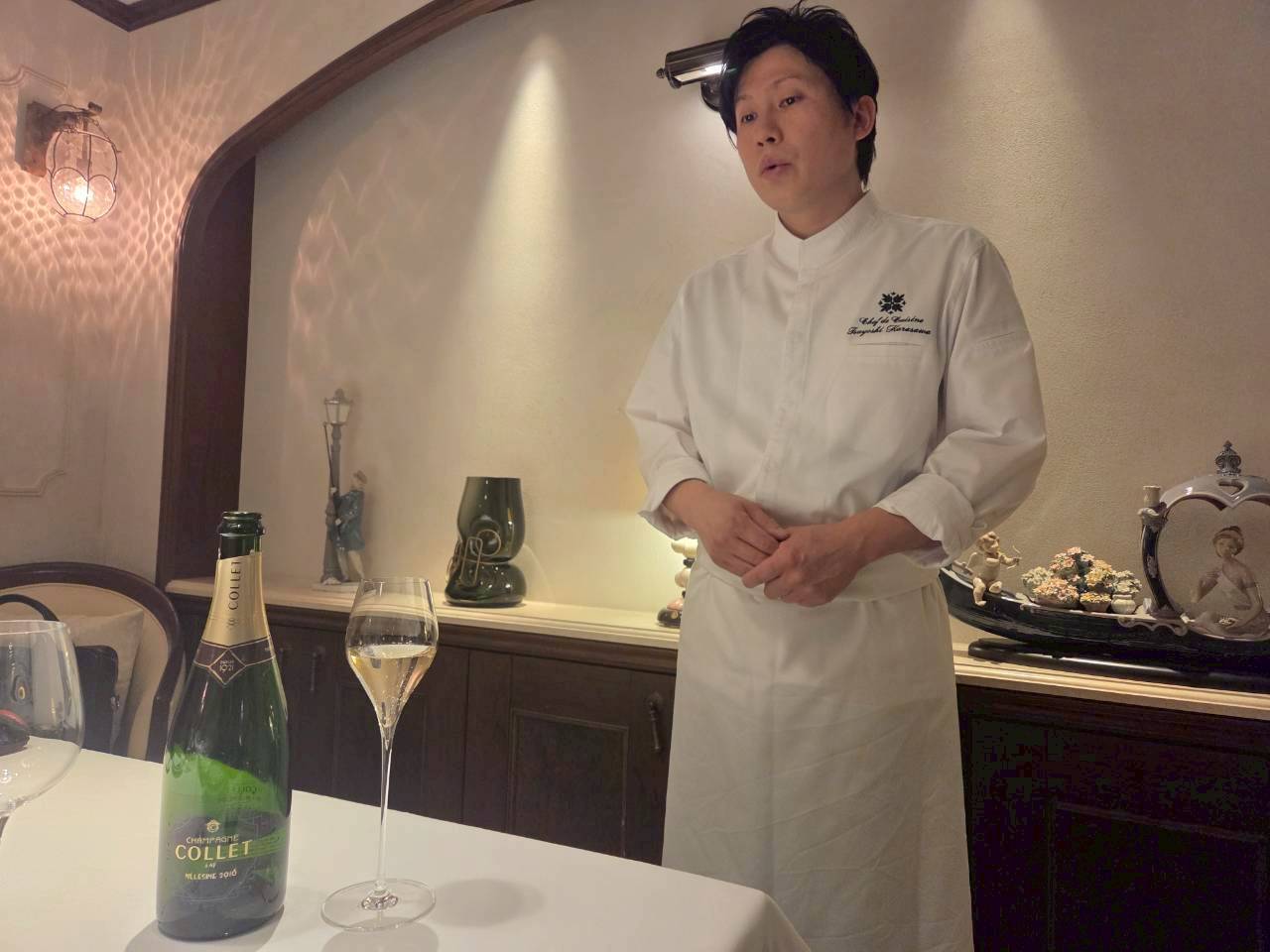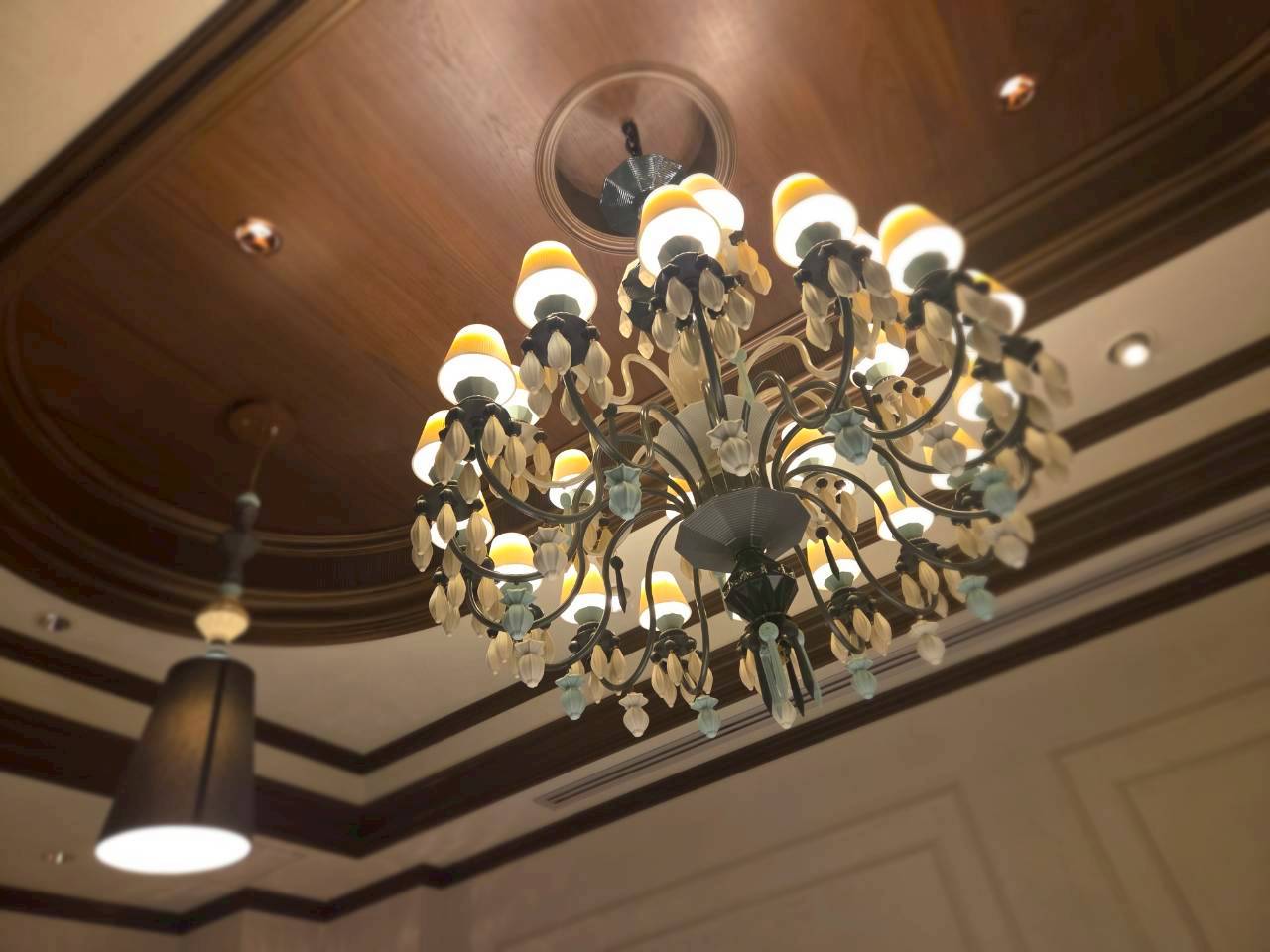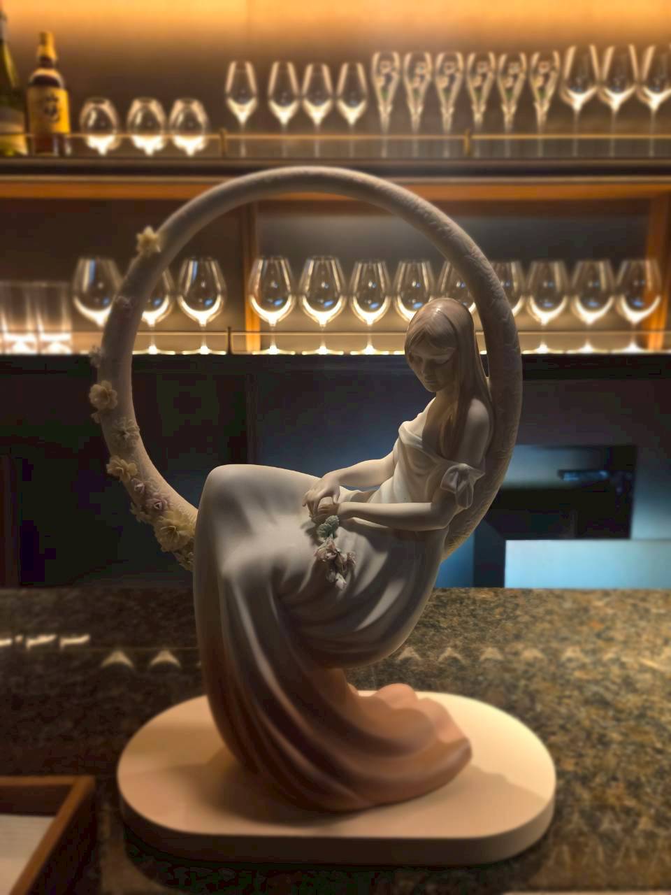 フランス語で「輝かしいシャンデリア」を意味します。地下へと続く荘厳な階段を下りると、そこには都会の喧騒を忘れるような、ゆったりと落ち着いた上質な空間が広がっています。店内は「リヤドロ」の煌びやかな調度品に彩られ、まさに店名通りの輝きに満ちていました。