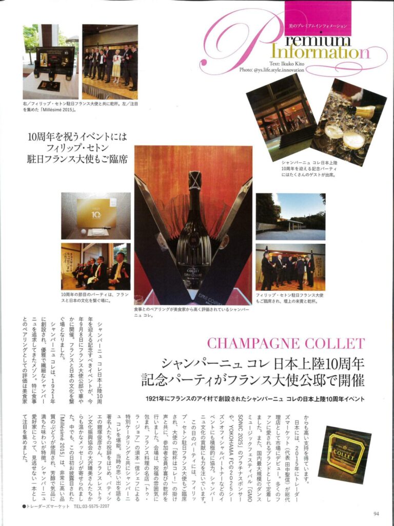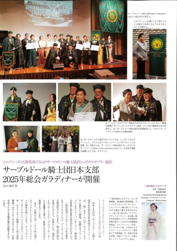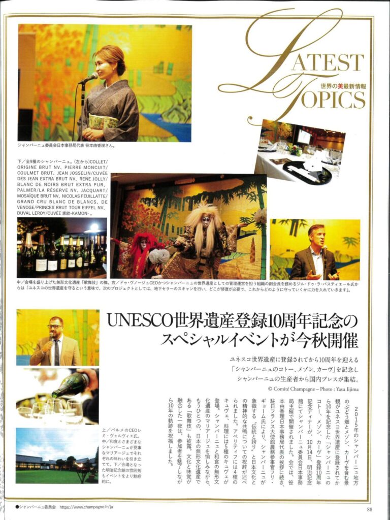 先日フランス大使公邸行われた、CHAMPAGNE COLLET 日本上陸10周年、サーブルドール騎士団日本支部2025年総会ガラディナー、UNESCO世界遺産登録10周年記念の様子を掲載していただきました!