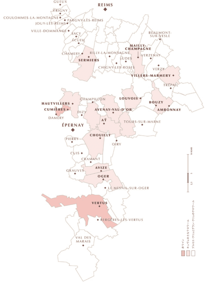 Aÿ, Villers-Marmery, Avenay-Val-d’Or, Verzenay, Louvois, Chouilly, Mailly-Champagne, Hautvillers, Oger, Avize, Vertus, Ambonnay, Bouzy, Sermiers.