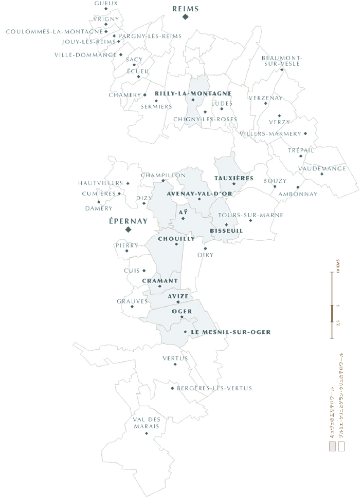 Chouilly, Cramant, Avenay-Val-D’Or, Bisseuil, Oger, Le Mesnil-sur-Oger, Avize, Rilly-la-Montagne, Tauxières.